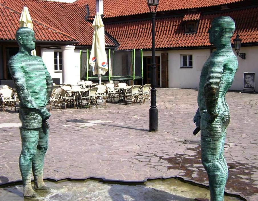 Lo interesante es que, si bien hablan muy en serio, al mismo tiempo son caprichosos y pueden burlarse de sí mismos.Piss Esta foto lo dice todo. Es del museo de Franz Kafka (Kafka escribió acerca del absurdo de la existencia. A propósito, como podrán observar, las estatuas funcionan como fuentes gemelas).