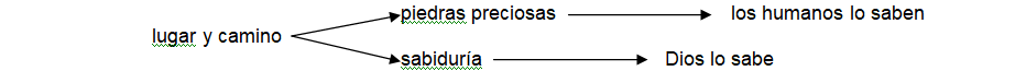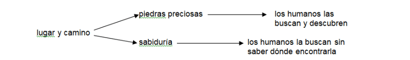 de la sabiduría. La terminología de buscar y ver, encontrar y oír, permea todo el pasaje. Está en la búsqueda secundaria de un lugar donde encontrar oro y en el hombre que “examina con detalle […] en esa densa oscuridad” (v. 3). El “camino” hacia las riquezas es por “lugares que las aves desconocen y que jamás vieron los ojos de los buitres”, por muy altivo que sea su deseo (v. 7). El hombre que las busca “cava la raíz de las montañas” (v. 9b) y “hace túneles en las rocas” (v. 10a) con tal de descubrir las piedras preciosas (v. 10b). Busca el tesoro que está escondido para “saca[r] a la luz muchas cosas escondidas” (v. 11b).